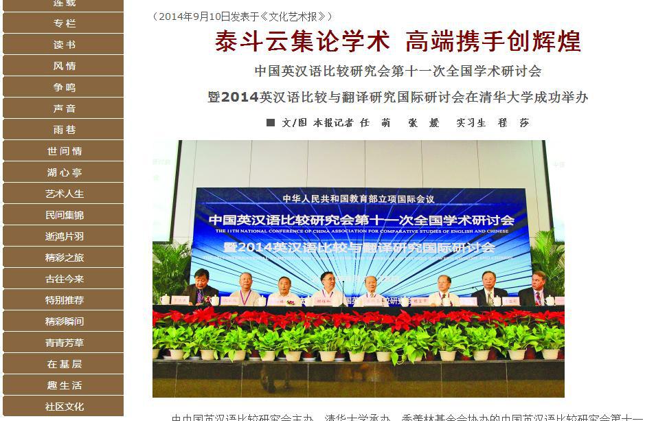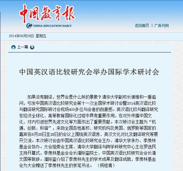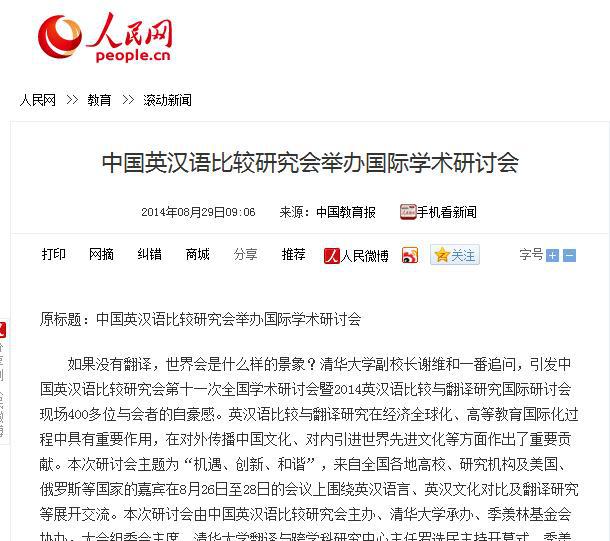 中国英汉语比较研究会第十一次全国学术研讨会暨2014英汉语比较与翻译研究国际研讨会于8月25-8月28日在美丽的清华园顺利召开。本次研讨会的主题是“机遇、创新、和谐”,来自美国、英国、加拿大、葡萄牙、新加坡、中国、香港、台湾、澳门等10个国家和地区的400余名专家和学者,就英汉语言、英汉文化对比以及翻译研究三大学术领域的前沿理论和热点问题展开深入地交流和探讨。