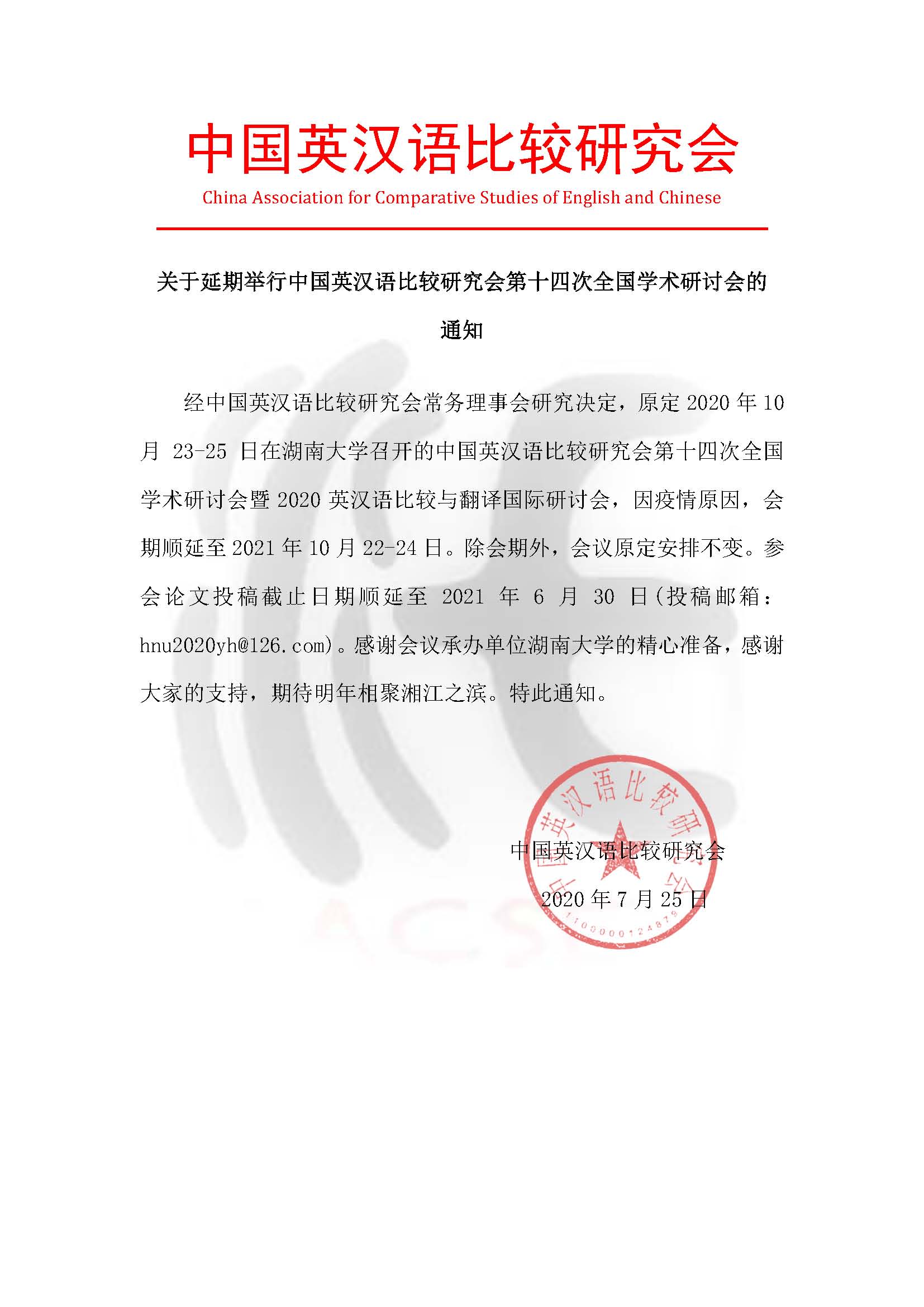 关于延期举行中国英汉语比较研究会第十四次全国学术研讨会的通知