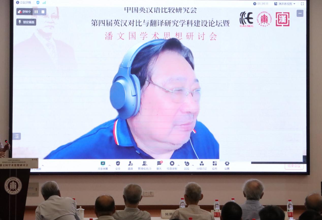 中国英汉语比较研究会翻译学科委员会副主任、广东外语外贸大学黄忠廉教授的报告题目是“学先生,接着说” 。他回顾了自己如何从拜读潘文国先生的作品《“看山看水”的启迪》,通过文本细读引导深度思考,梳理潘文国先生的思想理念,逐步催化《观翻译与翻译观》等著述的经历。《上海翻译》主编、上海大学傅敬民教授围绕“文章翻译学:理论价值与现实意义”这一题目作了发言。他提到,潘文国先生倡导的文章翻译学以中国传统文章学为理论基础,以建构中国特色翻译学为目标,主张翻译就是做文章,强调译者气质,提出“译文三合义体气”等融合中国传统哲学文化的观点,具有鲜明的中国翻译理论特色,对于当下中国翻译研究引领国际翻译研究具有很强的理论发展价值和现实意义。